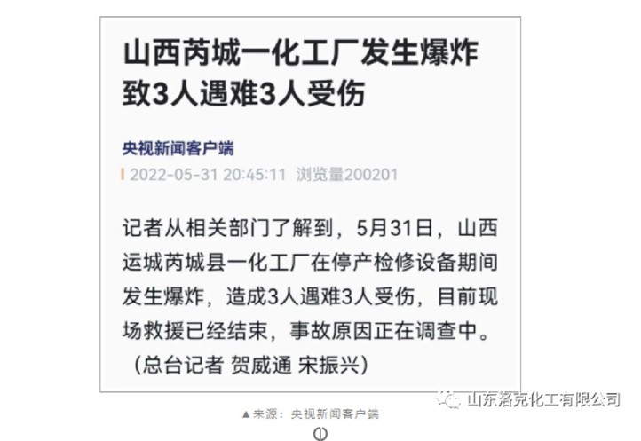 2022年5月31日,山西运城芮城县一化工厂在停产检修设备期间发生爆炸,造成3人遇难3人受伤!